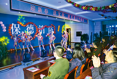 近日,保德縣委宣傳部、縣文化局組織文藝工作者走進(jìn)駐地警營(yíng),為他們書(shū)寫春聯(lián),并獻(xiàn)上了精彩的文藝演出。圖為演出現(xiàn)場(chǎng)。(李富永 攝)