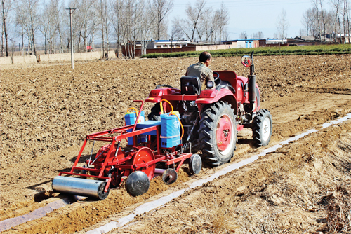 4月6日,原平市蘇龍口鎮(zhèn)計(jì)明農(nóng)機(jī)合作社農(nóng)民正在用集水鋪膜精播機(jī)播種旱地玉米。由原平四維農(nóng)機(jī)公司制造的集水鋪膜精播機(jī)可種植旱地玉米、高粱、谷子等多種農(nóng)作物,鋪膜下種一次完成,由于所鋪地膜中間形成凹槽,有利于收集雨水滲入禾苗根部,大大提高了旱地作物抗旱能力,受到山區(qū)農(nóng)民歡迎。(曹申義 攝)