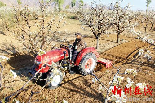 4月16日,原平市子干村民正在萬畝梨園搶墑春耕春播。原平市農(nóng)業(yè)、農(nóng)機、農(nóng)業(yè)技術(shù)推廣中心通過“現(xiàn)場直播”的方式,與鄉(xiāng)村進行對接,把旱地發(fā)展林果業(yè)和套播雜糧機播作為“一村一品”的特色之路,根據(jù)果樹樹冠的大小,合理確定種植小雜糧的品種和規(guī)模,實現(xiàn)了林糧兩不誤,收入大提高。(吉建平 攝)