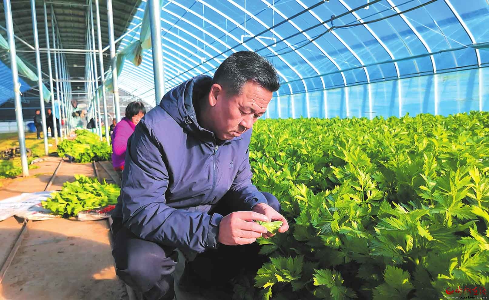 近日,忻府區(qū)農(nóng)業(yè)農(nóng)村局組織農(nóng)技專家團(tuán)隊(duì)深入忻口鎮(zhèn)高標(biāo)準(zhǔn)蔬菜育苗基地,開展越冬作物防寒防凍技術(shù)指導(dǎo)。圖為農(nóng)技專家查看芹菜生長狀態(tài)。(趙曼君攝)