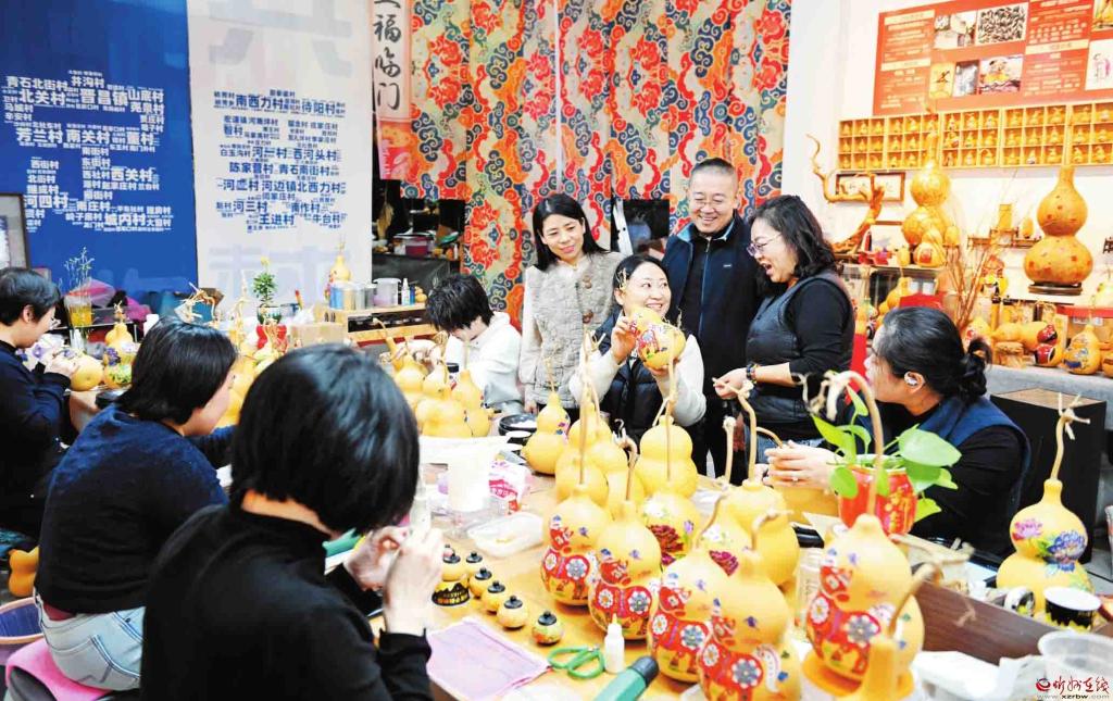 1月17日,定襄縣弘揚遠傳媒有限公司的員工正在趕制一批上海和香港訂制的葫蘆景泰藍馬年文創(chuàng)產(chǎn)品。(