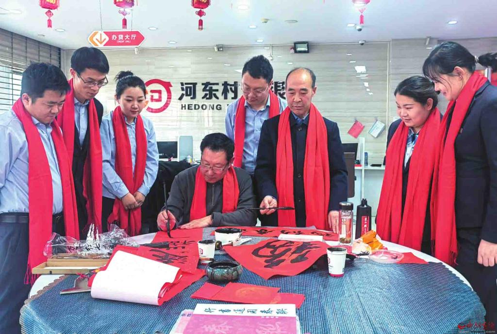 新春到來之際,神池縣河?xùn)|村鎮(zhèn)銀行邀請(qǐng)當(dāng)?shù)貢◥酆谜咴跔I業(yè)大廳現(xiàn)場揮毫潑墨,為前來辦理業(yè)務(wù)的客戶書寫春聯(lián),深受群眾稱贊。(楊晉明攝)