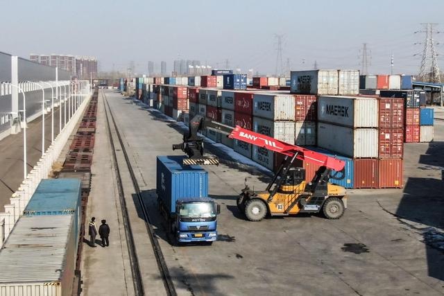 工作人員在沈陽東站東貨場向中歐班列上裝運集裝箱。新華社記者 潘昱龍 攝