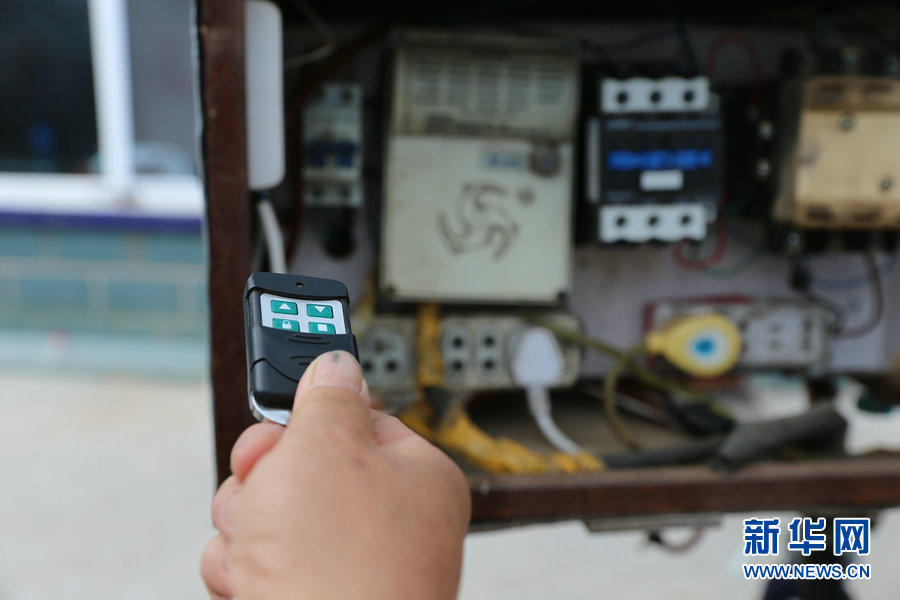 大棚里的噴灌設(shè)施可以通過遙控器控制,這是劉振義自己設(shè)計制作的“神器”。每天夜里,木耳大棚要澆兩次水,有了這個遙控器就不用再出門開關(guān)噴灌器了。新華網(wǎng)曹楨攝