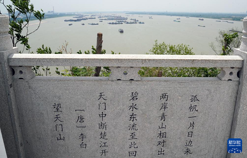 5月13日在天門山上拍攝的李白《望天門山》題刻,山下是繁忙的長(zhǎng)江航道。(新華社記者 馬寧 攝)