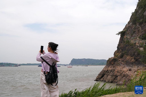 5月13日,游客在天門山腳下的長(zhǎng)江岸邊拍照。(新華社記者 馬寧 攝)
