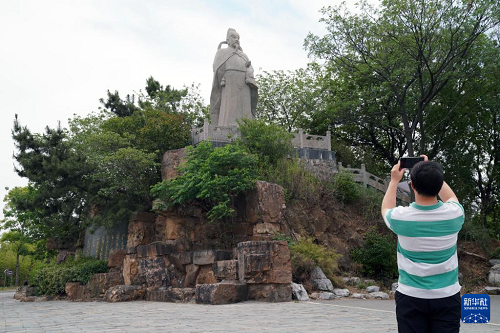 5月13日,游客在天門山景區(qū)拍攝李白雕像。(新華社記者 馬寧 攝)