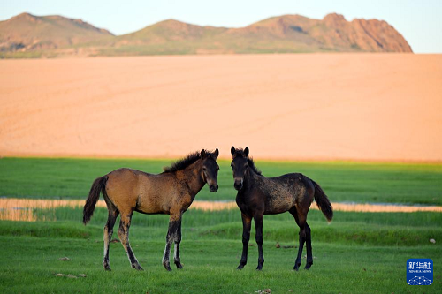 7月21日在內(nèi)蒙古自治區(qū)赤峰市巴林右旗大板鎮(zhèn)翁根毛都嘎查境內(nèi)的沙地草原拍攝的兩匹馬駒。(新華社發(fā) 馬衛(wèi)兵 攝)