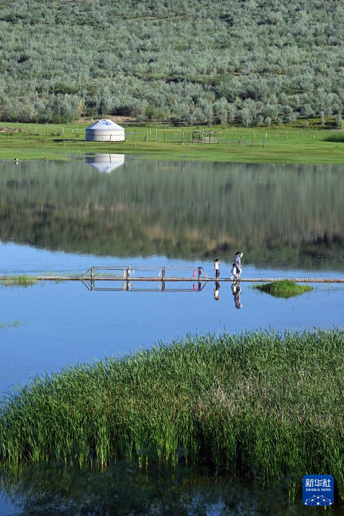 7月21日,游客走過(guò)內(nèi)蒙古自治區(qū)赤峰市巴林右旗大板鎮(zhèn)翁根毛都嘎查境內(nèi)的草原湖泊。(新華社發(fā) 馬衛(wèi)兵 攝)