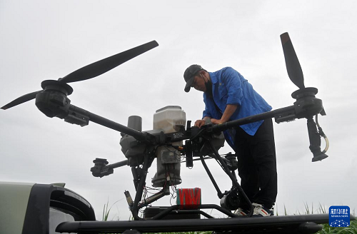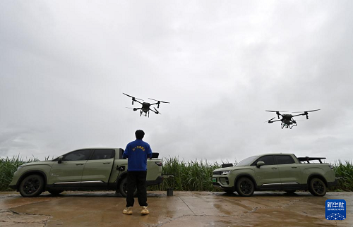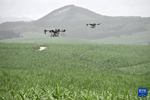 7月23日,在位于廣西上思縣的昌菱農(nóng)場(chǎng)蔗區(qū),技術(shù)人員操控?zé)o人機(jī)。(新華社記者 陸波岸 攝)