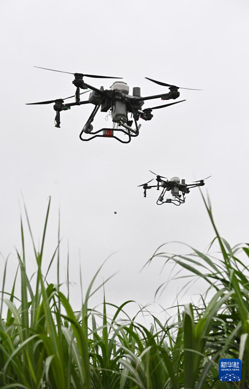 7月23日,在位于廣西上思縣的昌菱農(nóng)場(chǎng)蔗區(qū),無(wú)人機(jī)在飛行中釋放螟黃赤眼蜂球。(新華社記者 陸波岸 攝)