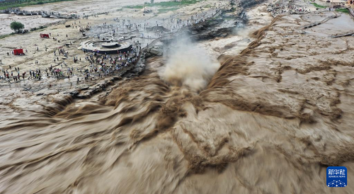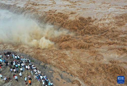 7月27日,人們在山西吉縣觀看黃河壺口瀑布(無人機照片)。(新華社發(fā) 呂桂明 攝)