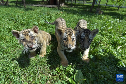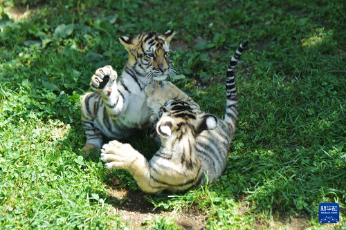 7月28日,橫道河子?xùn)|北虎林園的幼虎在草地上嬉戲。(新華社發(fā) 張春祥 攝)