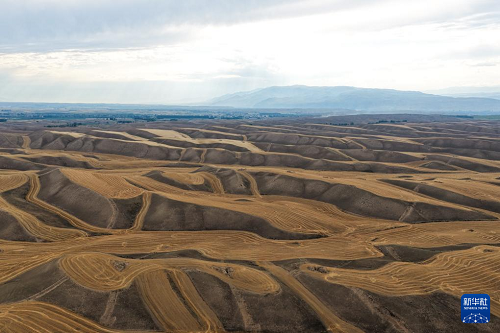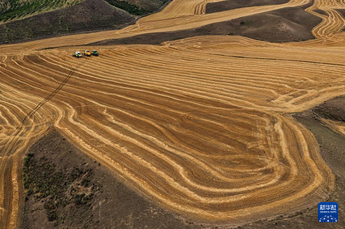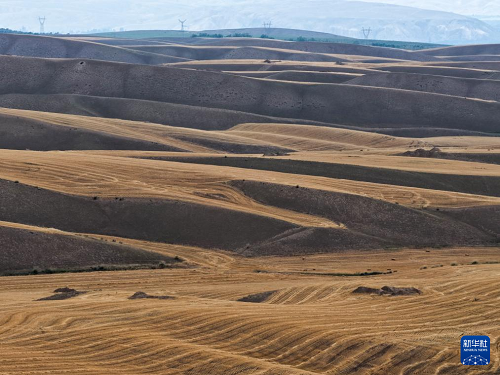 近日,在位于天山北麓的新疆維吾爾自治區(qū)伊犁哈薩克自治州特克斯縣,成熟的小麥迎來(lái)收獲。當(dāng)?shù)剞r(nóng)民搶抓有利天氣,開(kāi)展夏收工作。