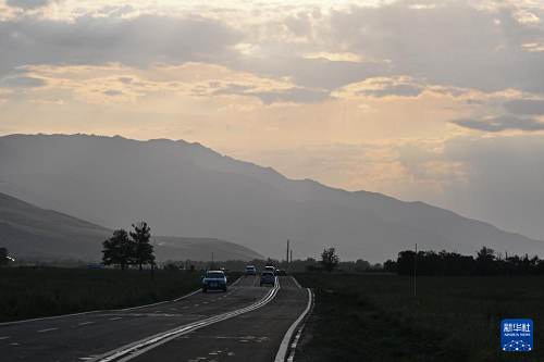 8月3日,車輛行駛在那拉提草原的道路上。(新華社記者 辛悅衛(wèi) 攝)