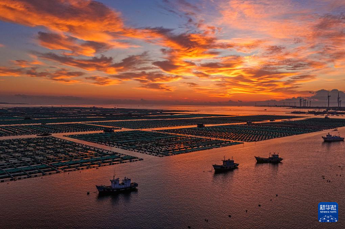 8月10日,山東省榮成市石島管理區(qū)桑溝灣海域朝霞絢麗,漁民駕駛漁船前往生態(tài)網(wǎng)箱養(yǎng)殖區(qū)進(jìn)行秋管作業(yè),海上生產(chǎn)一派繁忙景象。