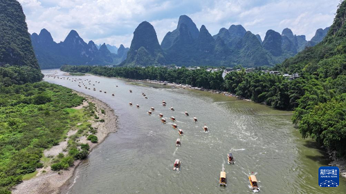 8月10日,在漓江廣西桂林市陽朔縣興坪鎮(zhèn)段,游客乘竹筏游玩賞景(無人機照片)。(新華社發(fā) 何紅福 攝)