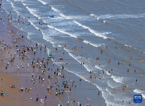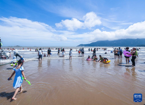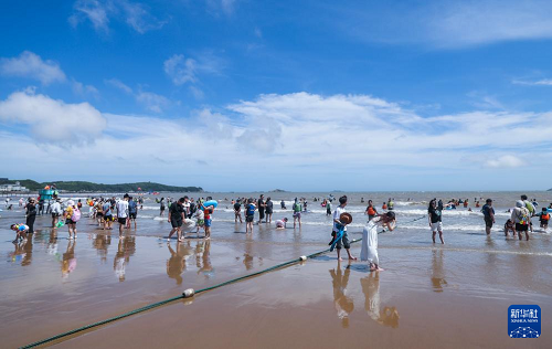 8月12日,游客在朱家尖南沙景區(qū)的海灘上游玩。(新華社記者 徐昱 攝)