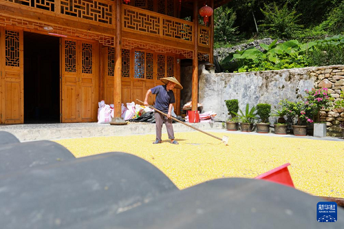 8月18日,猛董村村民在晾曬玉米。(新華社發(fā) 胡程 攝)