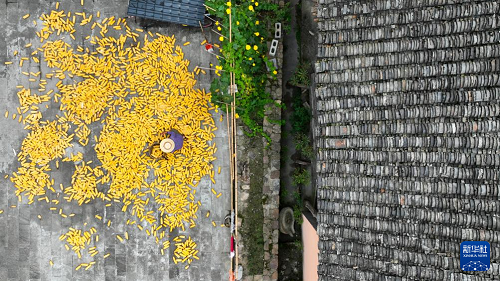 8月18日,猛董村村民在晾曬玉米(無人機照片)。(新華社發(fā) 胡程 攝)
