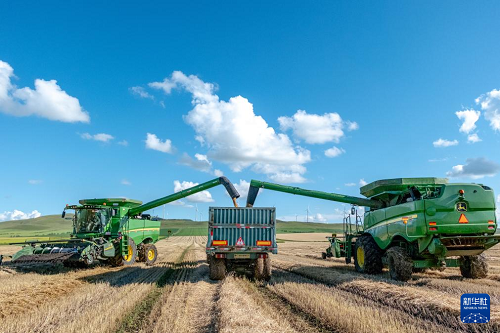 8月20日,呼倫貝爾農(nóng)墾拉布大林農(nóng)場的工人駕駛農(nóng)機(jī)將收獲的小麥裝車。(新華社記者 馬金瑞 攝)