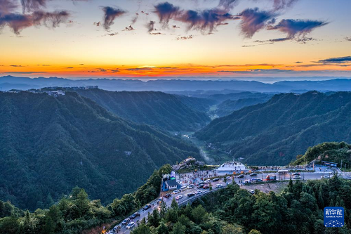 8月20日,游客在黃水鎮(zhèn)環(huán)湖路觀景臺欣賞晚霞景色(無人機照片)。(新華社記者 唐奕 攝)