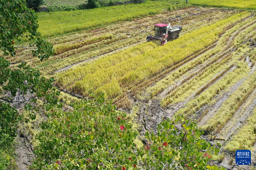 8月23日,農(nóng)民駕駛收割機(jī)在湖南省湘西土家族苗族自治州龍山縣石羔街道收割水稻(無人機(jī)照片)。(新華社發(fā) 曾祥輝 攝)