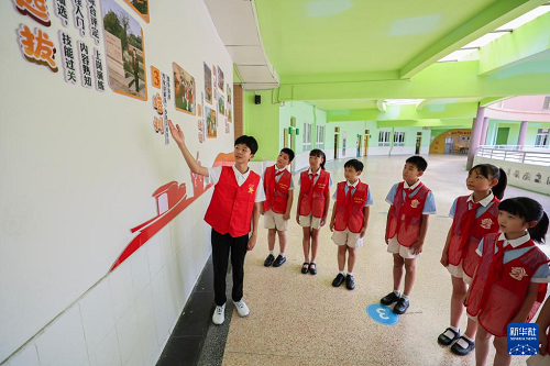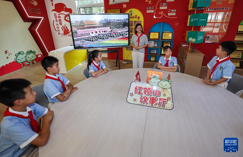 9月4日,浙江省“新時代好少年”、資深紅船小講解莫景鑠(左一)在嘉興市實驗小學(xué)給新一批紅船小講解員傳授自己的講解經(jīng)歷和經(jīng)驗,同時也介紹了學(xué)校紅船小講解的歷史由來。(新華社記者 徐昱 攝)
