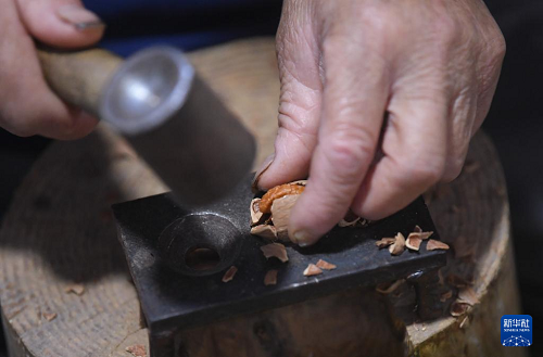 9月9日,在臨安龍崗鎮(zhèn)一家山核桃生產(chǎn)企業(yè),工作人員通過手敲山核桃取整仁。(新華社記者 翁忻旸 攝)