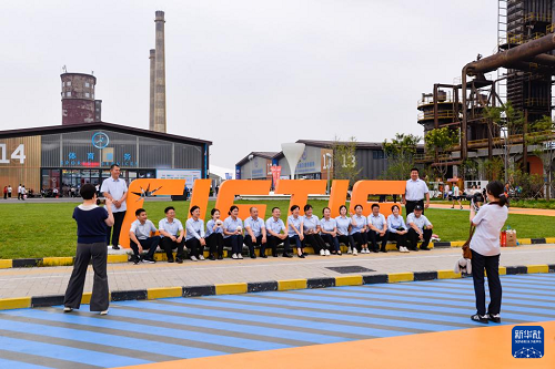 9月10日,工作人員在北京首鋼園與一處服貿(mào)會英文標(biāo)識合影。(新華社記者 徐欽 攝)