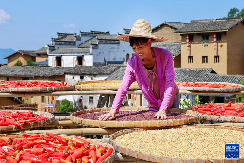 秋收時(shí)節(jié),在安徽省黃山市歙縣深渡鎮(zhèn)陽產(chǎn)村,村民利用晴好天氣,抓緊晾曬收獲的辣椒、玉米、山核桃等農(nóng)作物,描繪出一幅山村“曬秋”圖。