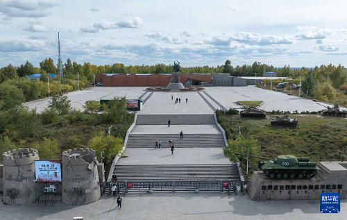 9月18日,人們?cè)趦?nèi)蒙古呼倫貝爾市海拉爾區(qū)世界反法西斯戰(zhàn)爭(zhēng)海拉爾紀(jì)念園參觀(無(wú)人機(jī)照片)。(新華社記者 貝赫 攝)