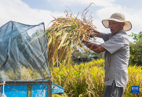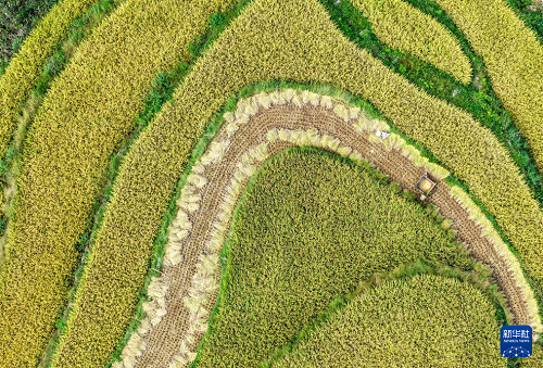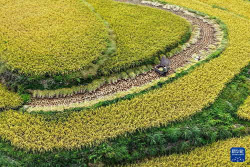 地處武陵山區(qū)腹地的重慶市黔江區(qū)五里鎮(zhèn)水稻種植面積5300畝,是武陵山地區(qū)糧食主要產(chǎn)區(qū)之一。秋收時(shí)節(jié),金黃色的水稻鋪滿山坡,稻農(nóng)們利用晴好天氣搶收稻谷,呈現(xiàn)出一派美麗的豐收畫卷。
