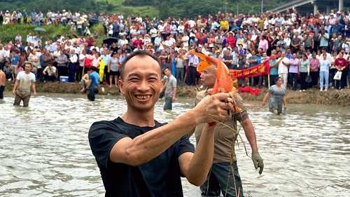 9月22日,在廣西南丹縣芒場鎮(zhèn)巴平村舉行的慶祝豐收節(jié)活動上,村民展示抓到的錦鯉。(新華社發(fā) 高東風(fēng) 攝)