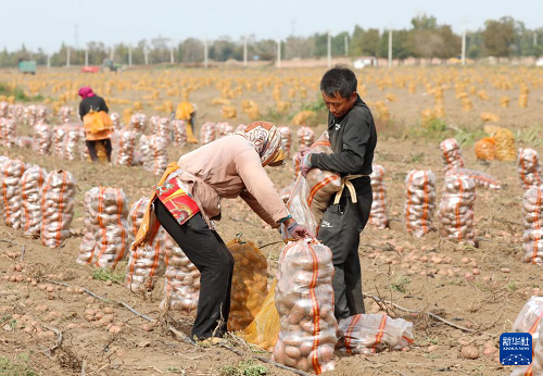 9月25日,河北省張家口市察北管理區(qū)一家馬鈴薯種植合作社的社員在田間收獲馬鈴薯。(新華社記者 楊世堯 攝)