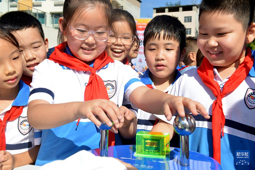 9月25日,四川省南充市南部縣紅巖子小學(xué)學(xué)生在體驗趣味科普裝置。(新華社發(fā) 張櫪 攝)