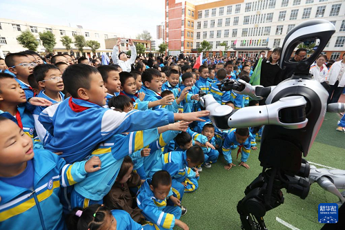 9月25日,在甘肅省定西市安定區(qū)西關(guān)小學(xué),學(xué)生和人形機(jī)器人互動。(新華社發(fā) 王克賢 攝)