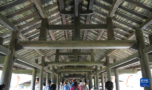 9月25日,游人行走在三江侗族自治縣程陽永濟(jì)橋上。(新華社記者 張楓 攝)