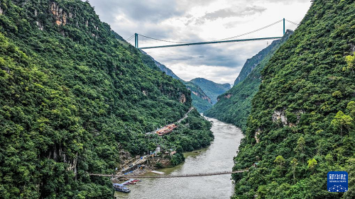景區(qū)內(nèi)的索道橋與遠(yuǎn)處的花江峽谷大橋遙相呼應(yīng)(9月27日攝,無人機照片)。(新華社記者 陶亮 攝)
