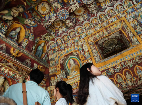 10月9日,在位于今潮8弄的戶外展區(qū),參觀者游覽云岡第12窟“音樂(lè)窟”的1:1復(fù)制洞窟。(新華社記者 劉穎 攝)