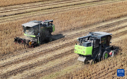 10月21日,收割機在天津市薊州區(qū)下窩頭鎮(zhèn)收獲大豆(無人機照片)。(新華社記者 李然 攝)