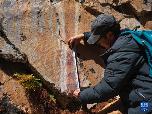 10月21日,陳雪松測(cè)量海子山老林溝拉托扎巖畫(huà)信息。(新華社記者 薛晨 攝)