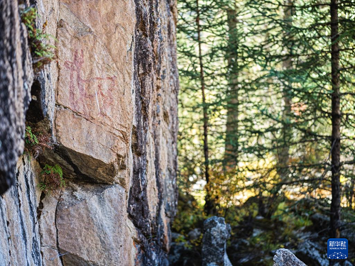 10月21日,陳雪松在實(shí)地調(diào)查海子山老林溝拉托扎巖畫(huà)。該處巖畫(huà)位于海子山南側(cè)老林溝內(nèi),巖畫(huà)由小型鹿圖案、三角形以及X型符號(hào)組成。(新華社記者 薛晨 攝)