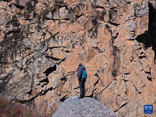 10月21日,陳雪松實(shí)地調(diào)查海子山老林溝拉托扎巖畫(huà)。(新華社記者 薛晨 攝)