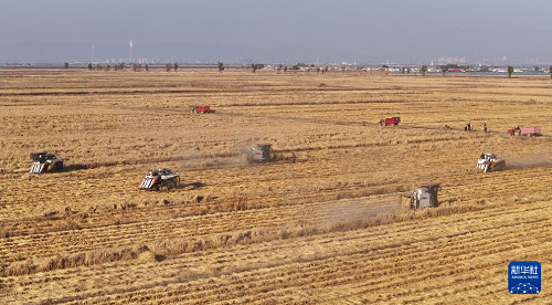 10月28日,農(nóng)民駕駛收割機(jī)在內(nèi)蒙古鄂爾多斯市達(dá)拉特旗昭君鎮(zhèn)沙圪堵村收獲水稻(無(wú)人機(jī)照片)。(新華社記者 賈立君 攝)