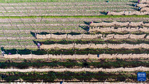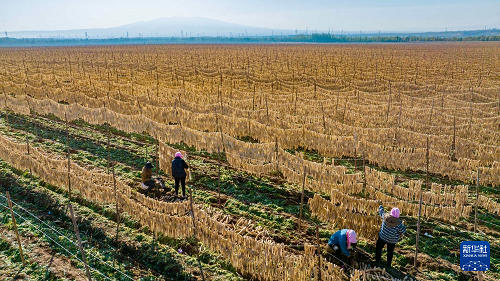 10月29日,農(nóng)民在寧夏吳忠市紅寺堡區(qū)紅寺堡鎮(zhèn)弘德村晾曬蘿卜條(無(wú)人機(jī)照片)。(新華社記者 楊植森 攝)