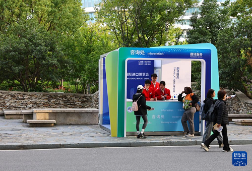 11月3日,志愿者在國家會(huì)展中心(上海)的一個(gè)咨詢處內(nèi)工作。(新華社記者 方喆 攝)