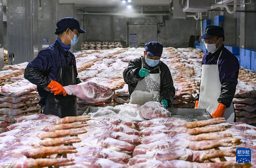 11月6日,在浙江省金華金年火腿有限公司車間內(nèi),技師在腌制火腿。(新華社發(fā) 時(shí)寬兵 攝)