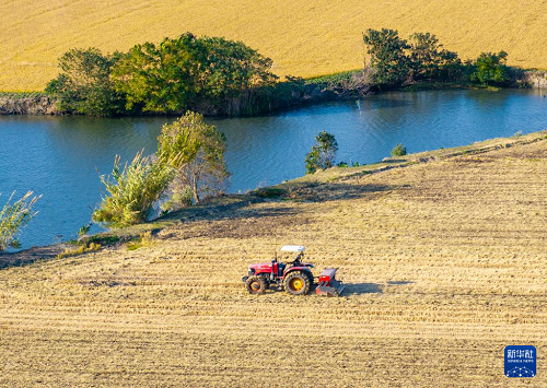 11月19日,在江蘇省常州市金壇區(qū)金城鎮(zhèn),農(nóng)機(jī)在田里播種小麥。(新華社發(fā) 陳暐 攝)