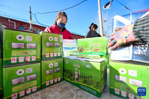 11月20日,在天津市西青區(qū)辛口鎮(zhèn),農(nóng)民在打包準(zhǔn)備發(fā)運(yùn)的沙窩蘿卜。(新華社記者 趙子碩 攝)